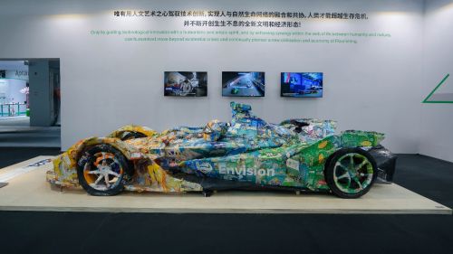 其中,远景塑料垃圾艺术车是展览的重头戏。据悉,这辆曾亮相COP26联合国气候变化大会世界领导人峰会主会场的“网红垃圾车”,由世界冠军车队——远景电动方程式车队联合英国设计事务所Lazerian共同打造,以100公斤塑料垃圾为原材料,耗时700小时纯手工制作,1:1还原了电动方程式赛车。以赛车运动为载体,这件艺术品用“反塑”作为主题,旨在喊出下一代对于气候问题的担忧,在全球舞台展现出以远景为代表的中国企业的先锋意识与社会责任感。