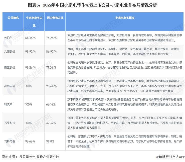 在小家电产业-整体制造的上市公司中,除格力电器的小家电业务占比相对较低之外,其余上市公司小家电业务占比均较高,其中美的小家电综合制造技术水平在国内处于行业绝对领先地位。分业务领域来看,在厨房小家电领域,美的集团、苏泊尔及九阳股份市场份额位列前三;家居小家电领域,科沃斯、石头科技市场份额较高;个护小家电领域,外国品牌戴森、松下、飞利浦实力强劲,中国品牌飞科电器市场份额位列前五。在区域布局方面,美的集团、苏泊尔、新宝股份、科沃斯、石头科技海外布局占比也较高,但整体看来,行业内企业均仍主要以国内为主要布局区域。