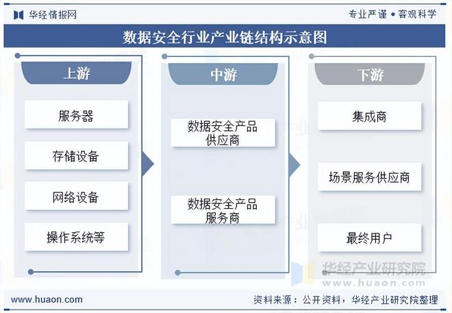 数据安全产业链上游主要包括服务器厂商、存储设备制造商、网络设备制造商、操作系统开发商等基础软硬件的供应商,他们提供的硬件和软件能够保证数据传输和存储时的安全性和稳定性。中游则主要以数据安全产品供应商和服务商为主,例数据加解密、数据库安全、数据防泄漏以及咨询安全,运维服务等。下游市场主要参与者包括集成商、场景服务供应商和最终用户。
