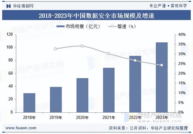 随着数据泄露、隐私侵犯等安全事件频发,数据安全重要性日益凸显,数据安全的需求日益上升。在中国,数据安全产业正迎来前所未有的发展机遇,产业进入飞速发展期,市场规模不断扩容,成为保障国家数据安全、推动数字经济高质量发展的关键力量之一。我国数据安全市场规模在2023年突破百亿元,同比增长24.14%,2018至2023年期间复合年增长率达到29.46%。