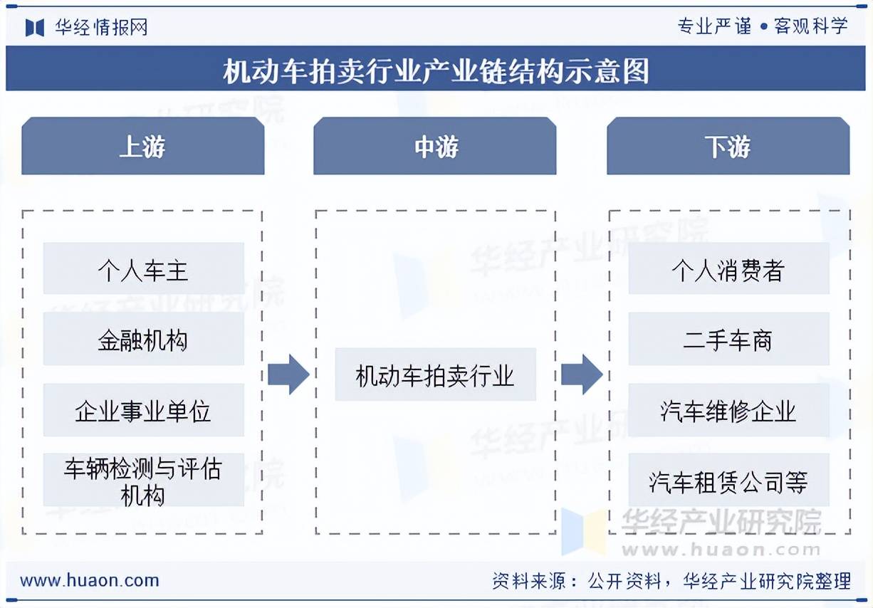 机动车拍卖行业产业链上游主要包括机动车供应方与车辆检测与评估机构,其中机动车供应方包括个人车主、汽车经销商、汽车租赁公司、金融机构(如银行、资产管理公司)、企事业单位等。车辆检测与评估机构提供专业的第三方机构对机动车的技术状况、价值等进行检测和评估,为拍卖提供准确的车辆信息,帮助确定合理的起拍价和参考价。产业链下游包括个人消费者、二手车商、汽车维修企业、汽车租赁公司等。