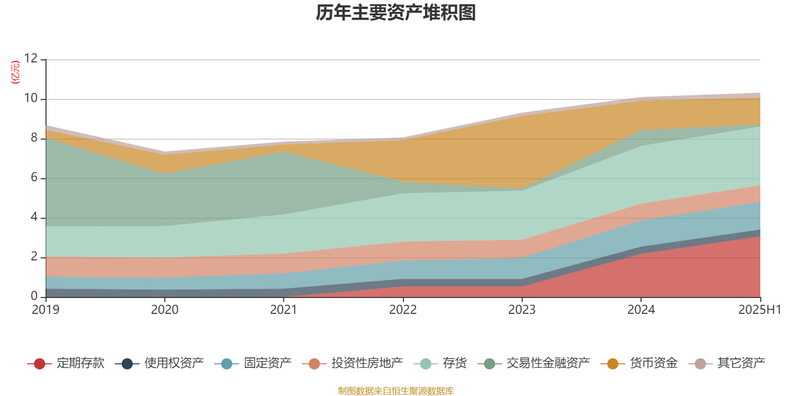 资产重大变化方面,截至2025年上半年,公司定期存款较上期末增加40.37%,占公司总资产比重上升8.07个百分点;交易性金融资产较上期末减少87.62%,占公司总资产比重下降7.04个百分点;货币资金较上期末减少6.94%,占公司总资产比重下降1.3个百分点;固定资产较上期末增加5.7%,占公司总资产比重上升0.45个百分点。