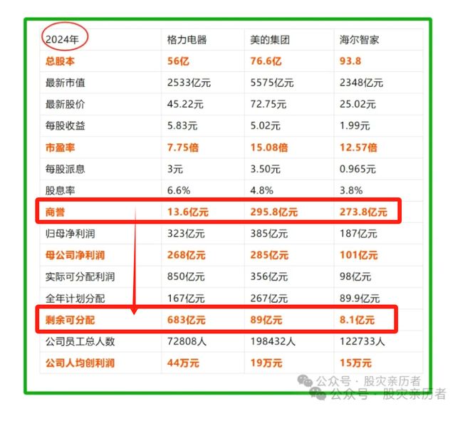 一是截至2024年报披露的数据,公司给股东分配完2024年度股息之后,格力电器账上剩余的可分配的利润依然还有600多亿元,而美的集团和海尔智家两公司账上剩余的可分配利润不足百亿元了。