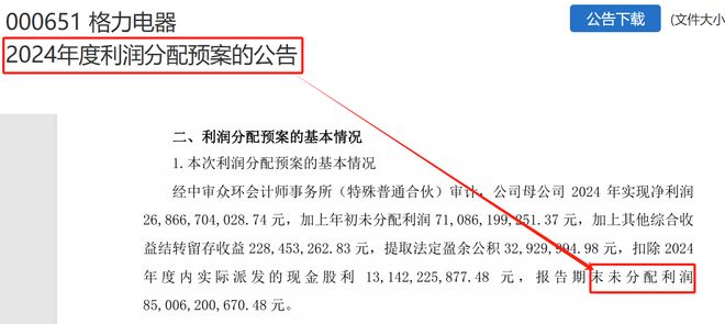 今天我首先要给大家普及一个公司财务常识,上市公司的“未分配利润”与“可分配利润”,是性质不同的两种利润。可现实中,别说普通的股民,即便是专业的基金机构投资者也未必都能了解和区分这两种利润的区别。当然,这也不能完全怪他们。因为上市公司自己也经常将这两个名词混为一谈,出现在自己的公告上。举例来说,格力电器公司自己就是这样的。先看2023年格力电器利润分配的公告: