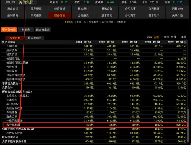 同时我们通常因为只会看股票交易软件上的F10资料。美的集团未分配利润2020年的未分配利润只有870亿元,比格力电器少。可这几年美的集团几乎按照等差数列的样子逐级增长增长,到2024年已经变成1500多亿元,超过了格力电器的1300多亿元,就真的以为美的全面超越格力,已经是老大了。